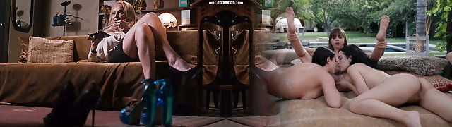Mature lesbian voyeur chicks fingerblasting and pussy pleasuring on spycam with milf bbw and blonde girlfriends in sofa