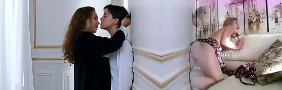 After noticing the brunettes massaging their boobs the girl/girl milf teaches them everything in a threesome