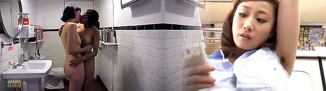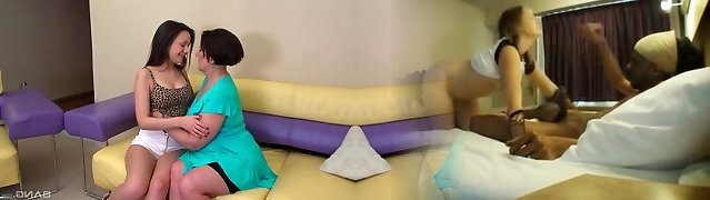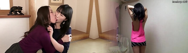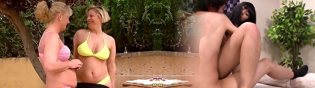After noticing the brunettes massaging their boobs the girl/girl milf teaches them everything in a threesome
