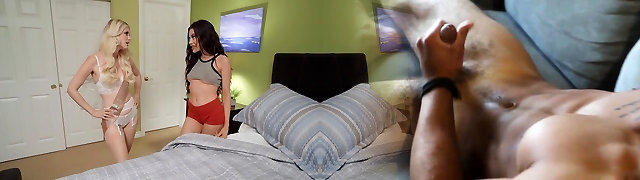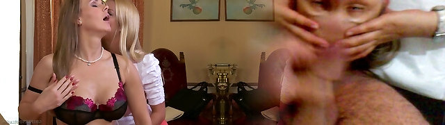 Blondie lesbian babes with gigantic tits tease play in sexy white lingerie nylons