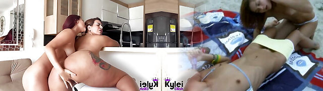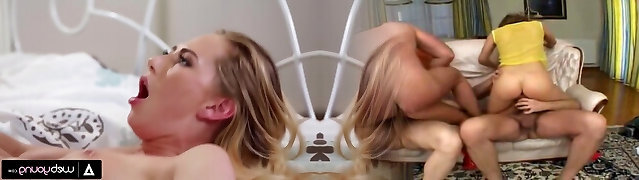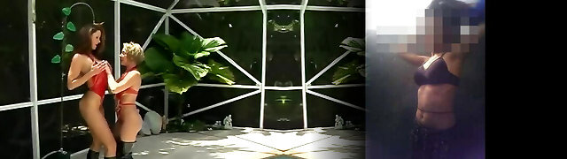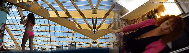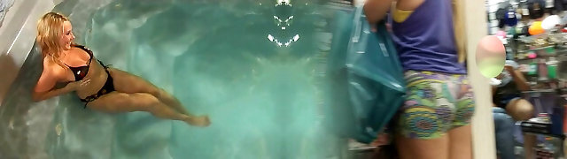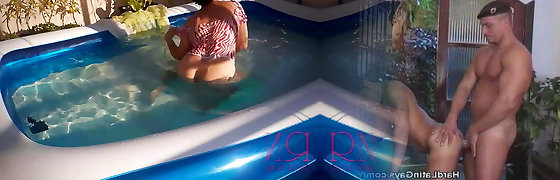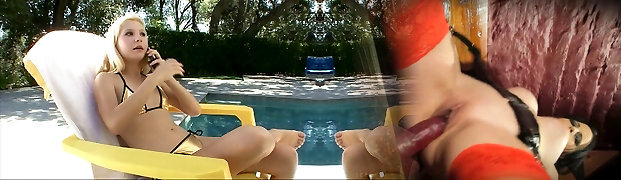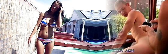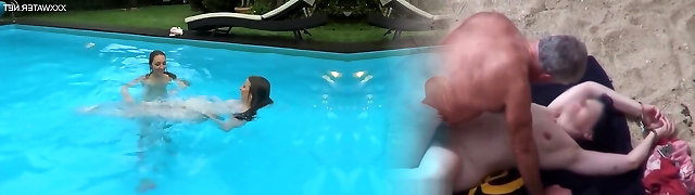 Sandy-haired Abigaiil Morris is having some naughty joy in the sun shaking her big tits and ass by the pool, curvaceous brunette Sammy Tor