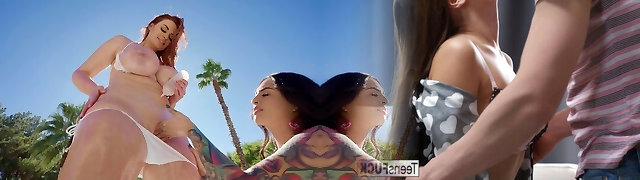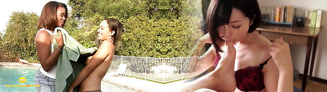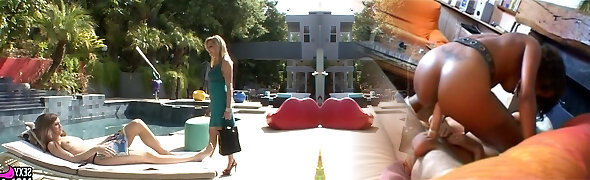 Girl-on-girl interracial sex by the swimming pool and on a red couch between two skinny atractive girls