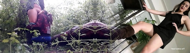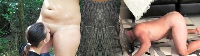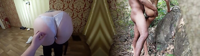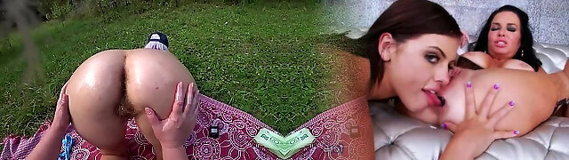 Lesbian with a strapon drilled girlfriend outdoors. Juicy butt and hairy pussy in oil. Point Of View.