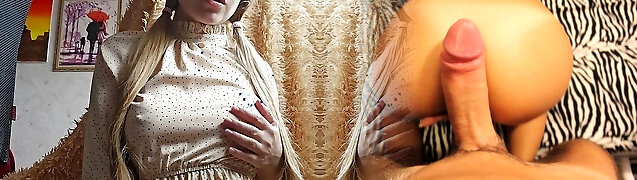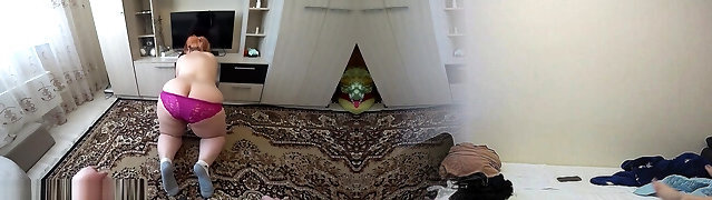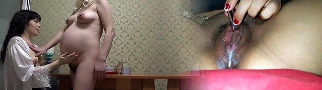 A pregnant milf jumps on a lesbian, inserting a strapon in wooly pussy. Natural breasts and juicy ass POV.