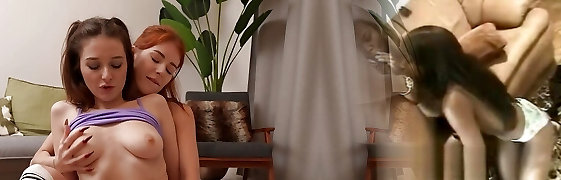 Pretty girl/girl is masturbating by the fireplace and then her lesbian acquaintance comes to join her