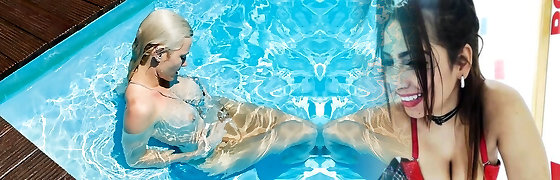 Wild girl-on-girl threesome with Adel Morel by the outdoors pool