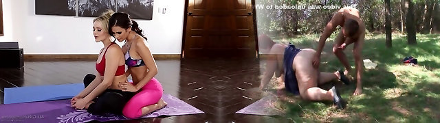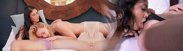 Unable to control herself while dreaming the blonde starts a threesome with the 2 busty lezzy milfs
