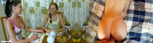She gobbles my nipples and masturbates my pussy in the kitchen with messy talk - Lesbian-illusion