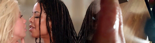 Interracial girl/girl action involving a tall huge-boobed ebony lesbian and a cute chick with perky tits