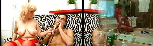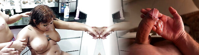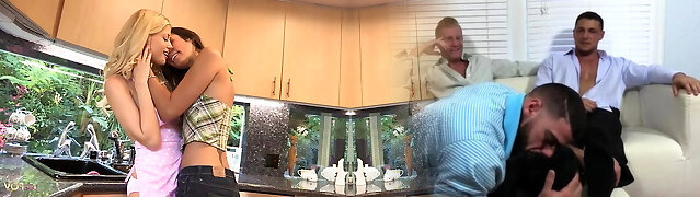 Kitchen activities get wet as the bare blonde gets on the counter with her lesbie brunette friend